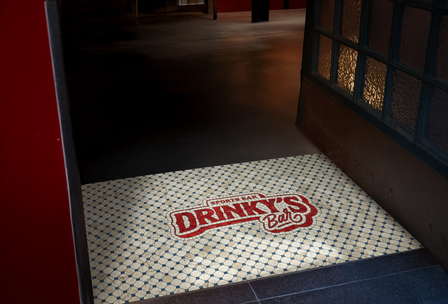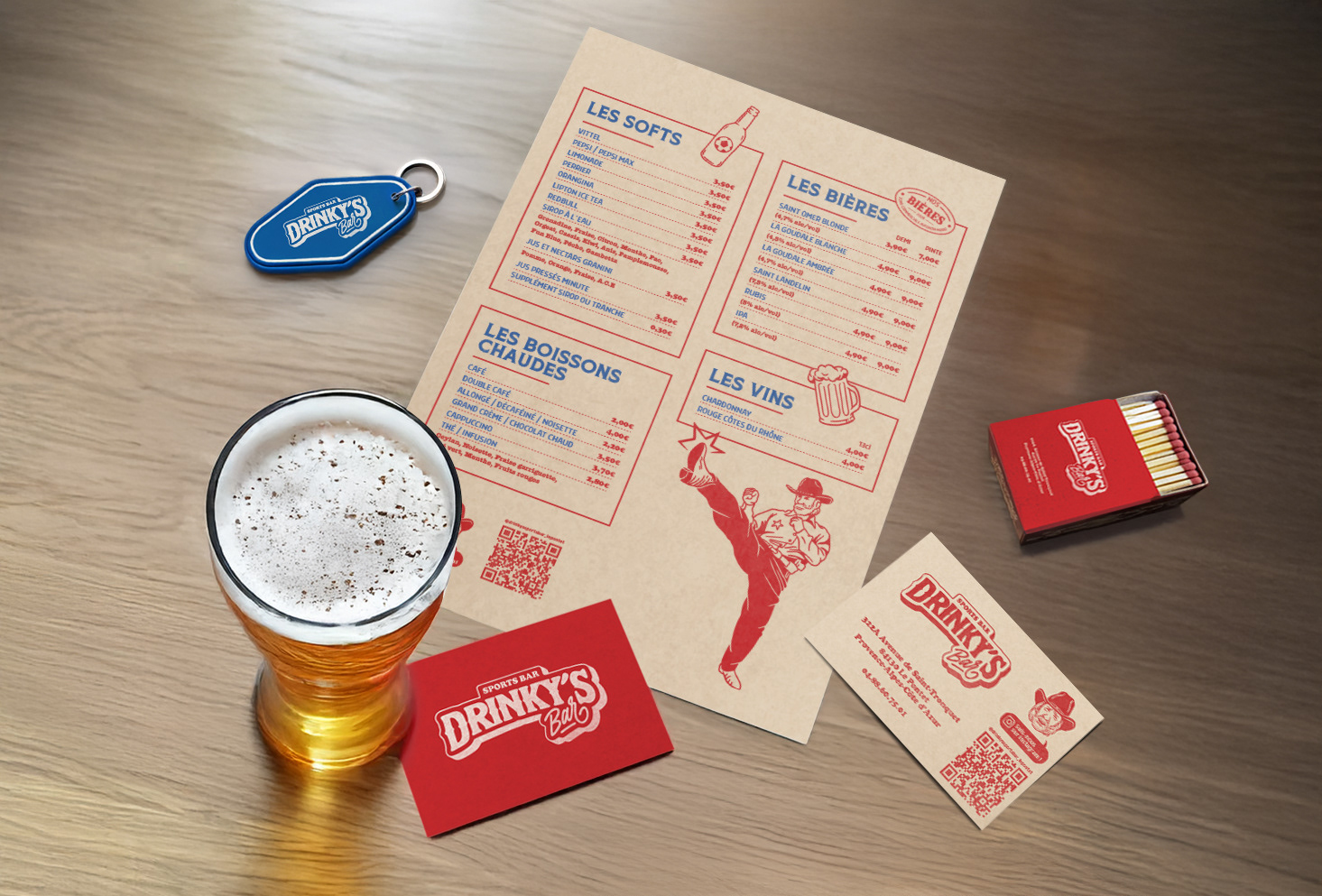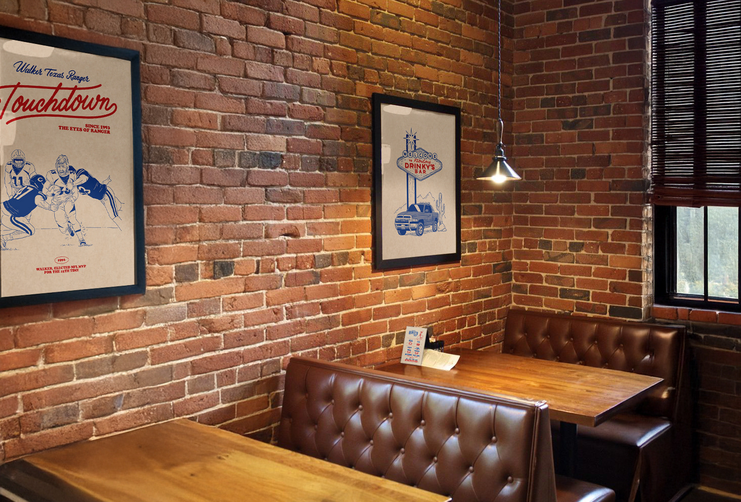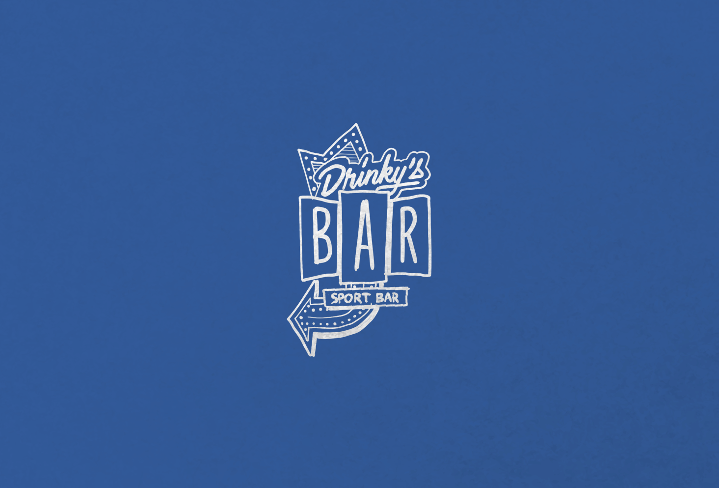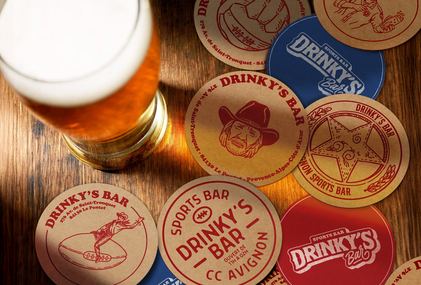 Création compléte de l'identité visuelle du Drinky's Bar (logo, illustrations, menus, etc..) qui est un bar situé à Avignon. Le Drinky's est un bar à vocation sportive, et à de fortes réferences américaines, nottament aux dimanches en famille devant Walker Texas Ranger, qui est l'icone de cet établissement.