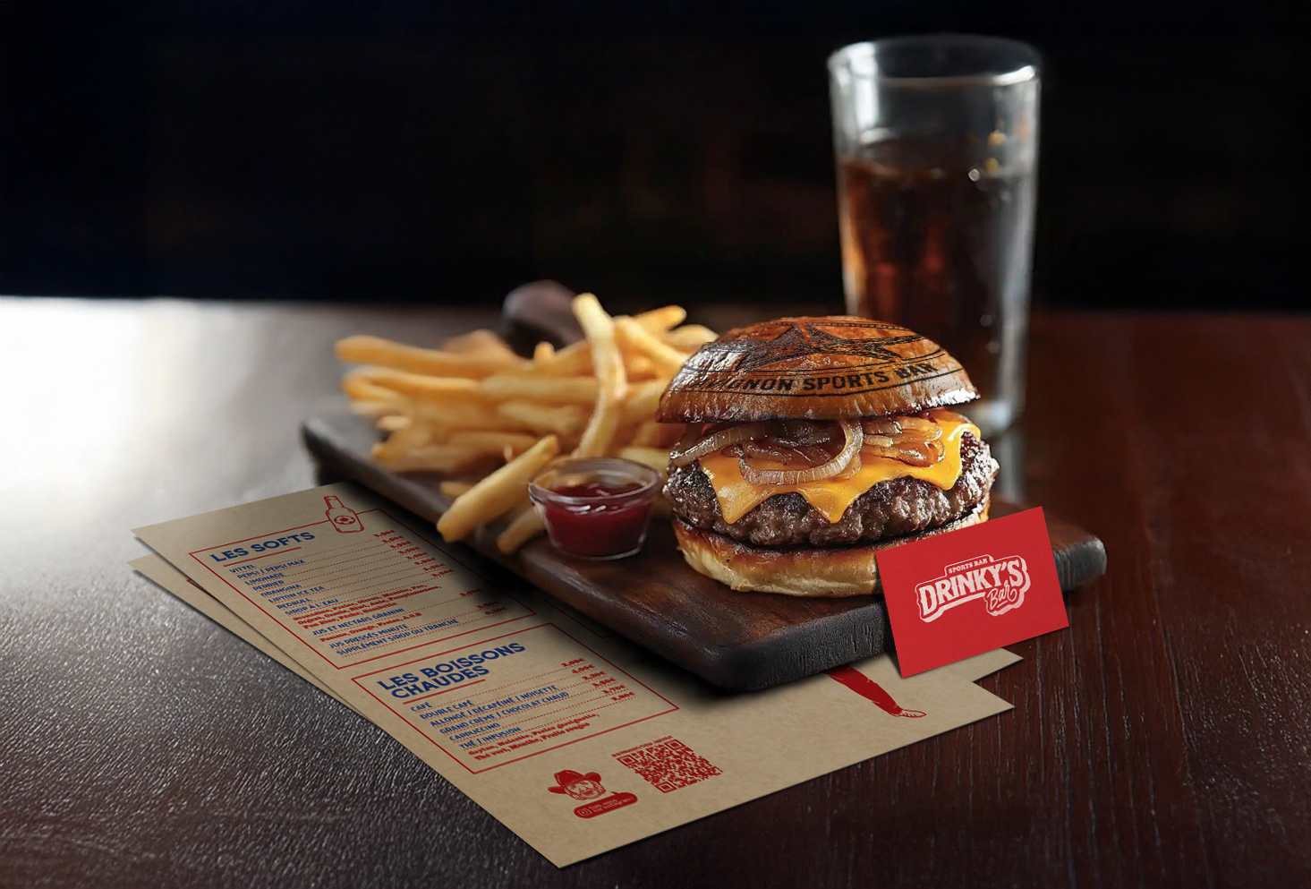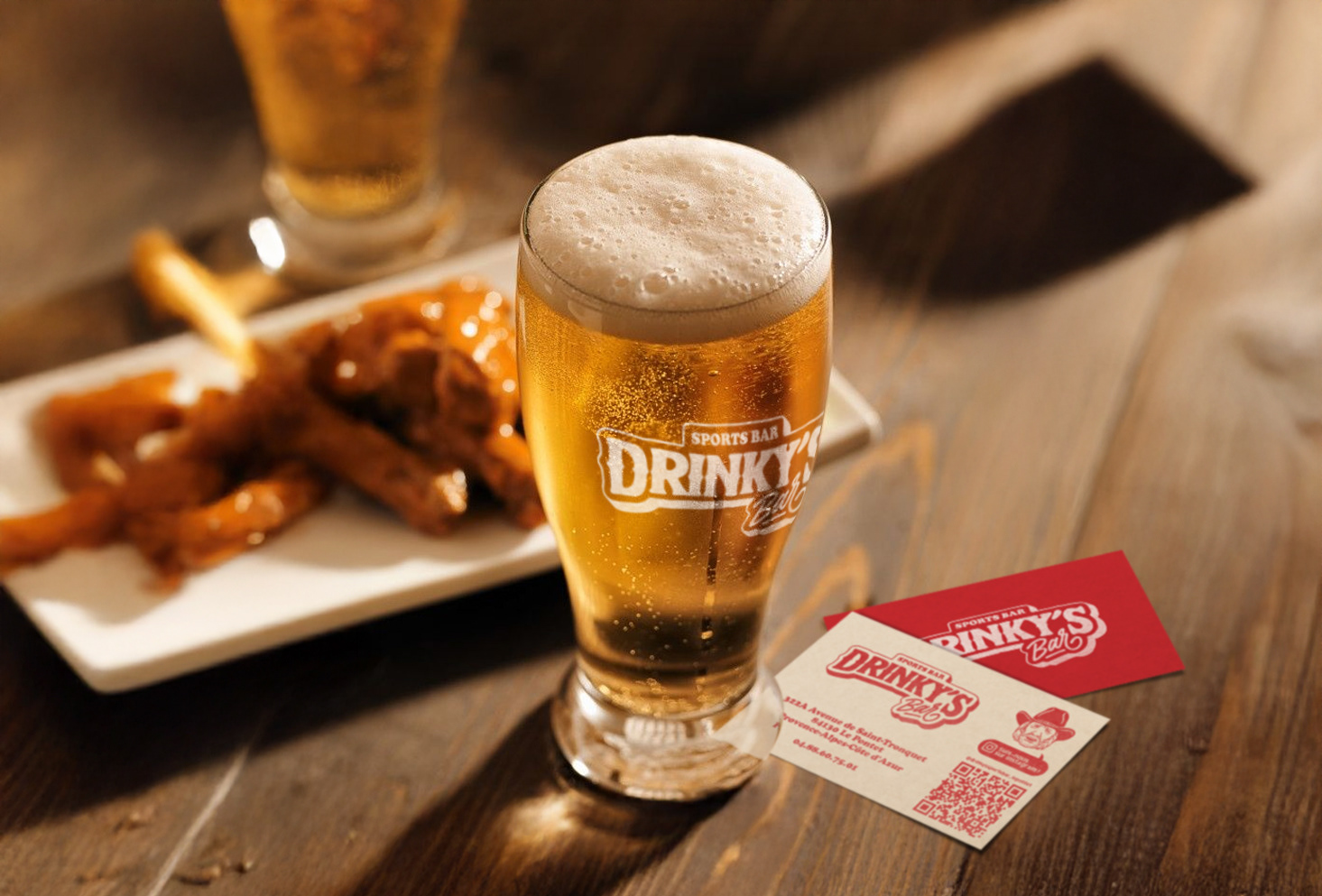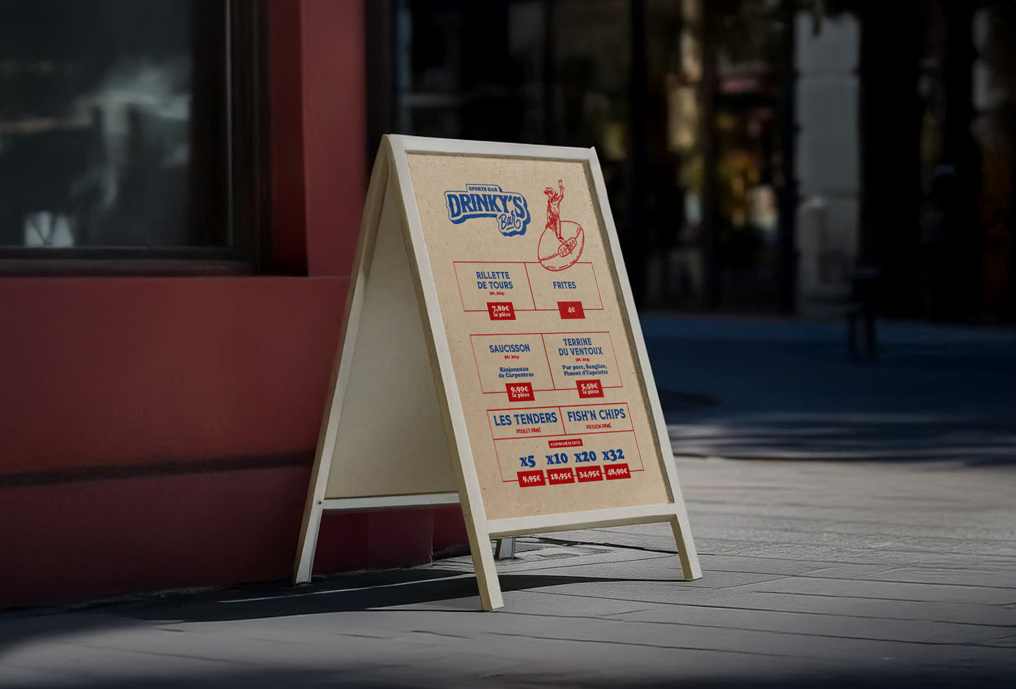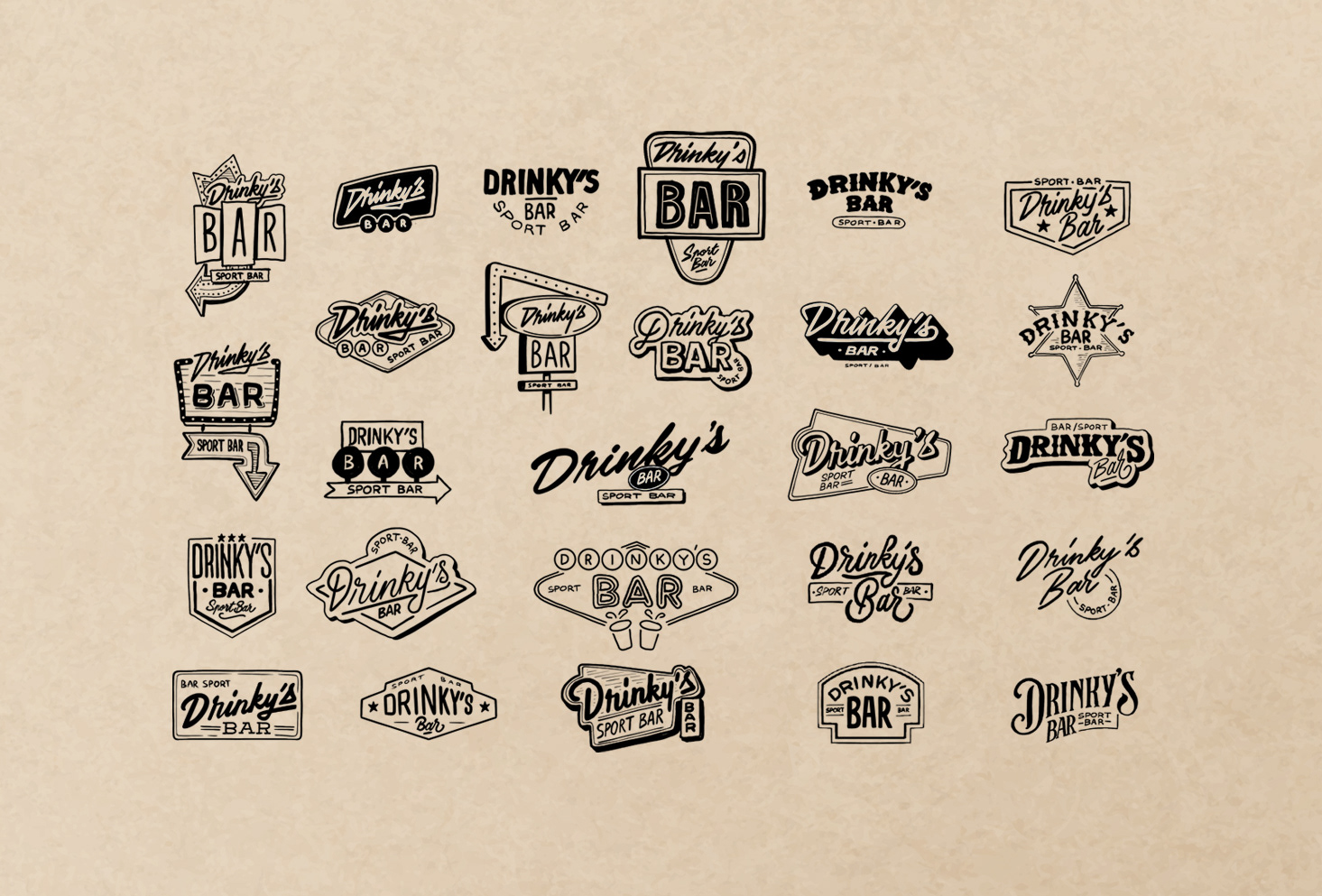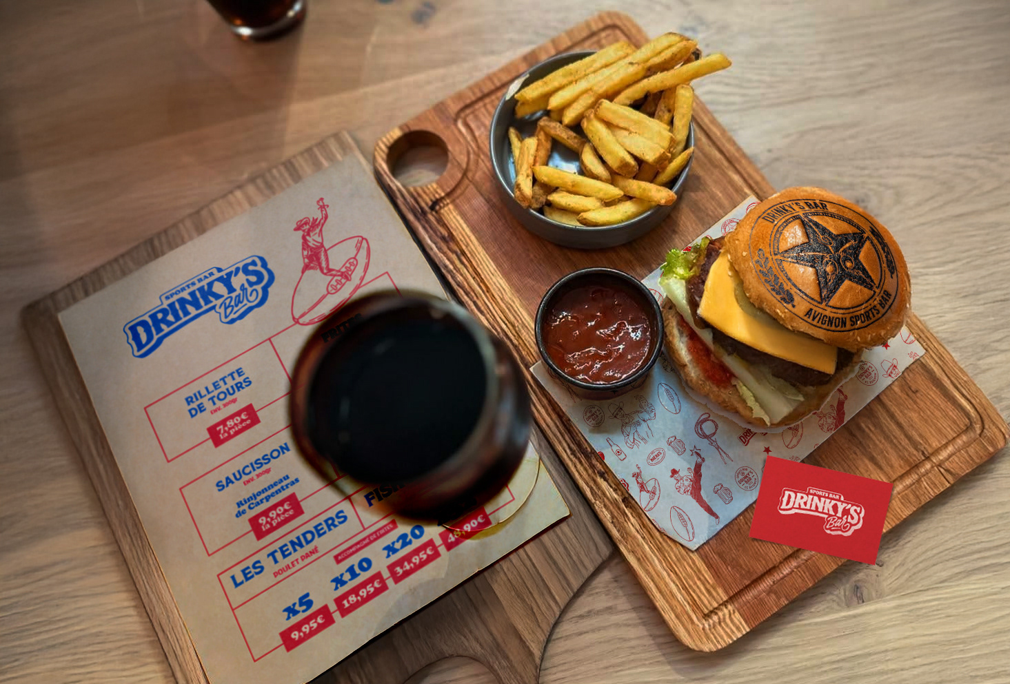 Création compléte de l'identité visuelle du Drinky's Bar (logo, illustrations, menus, etc..) qui est un bar situé à Avignon. Le Drinky's est un bar à vocation sportive, et à de fortes réferences américaines, nottament aux dimanches en famille devant Walker Texas Ranger, qui est l'icone de cet établissement.