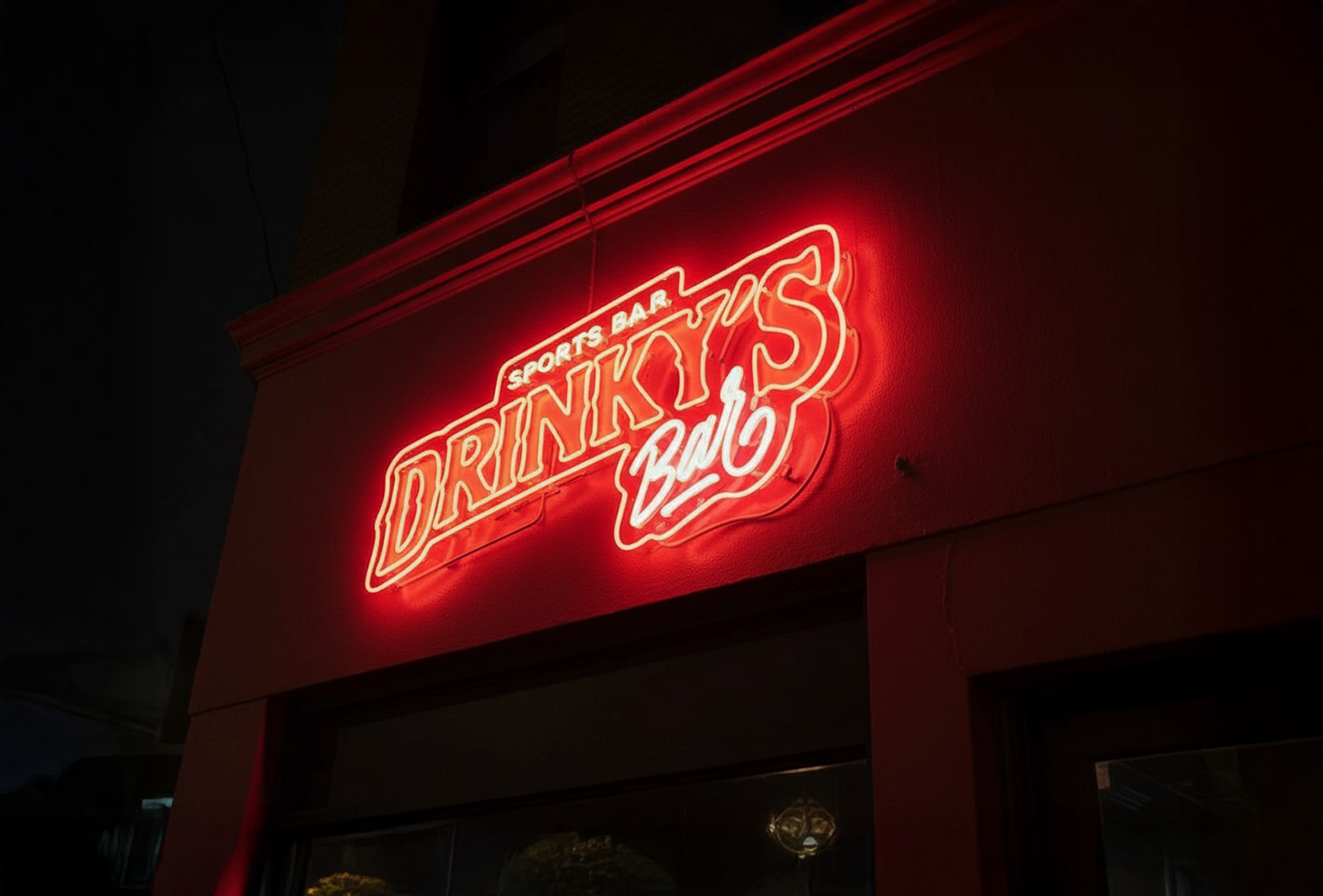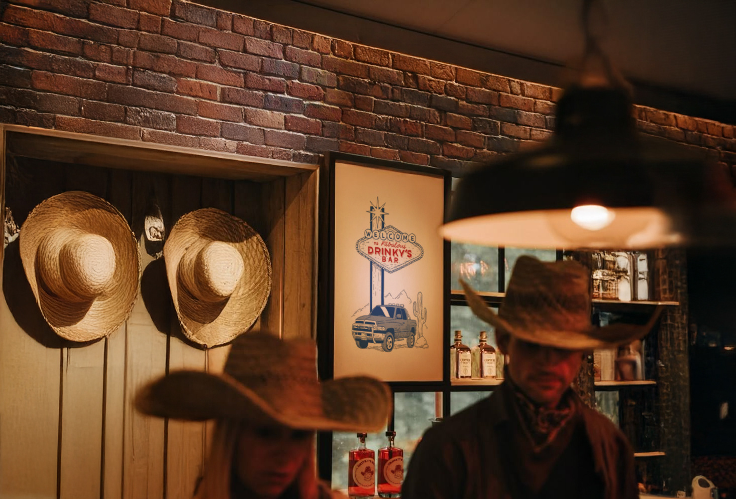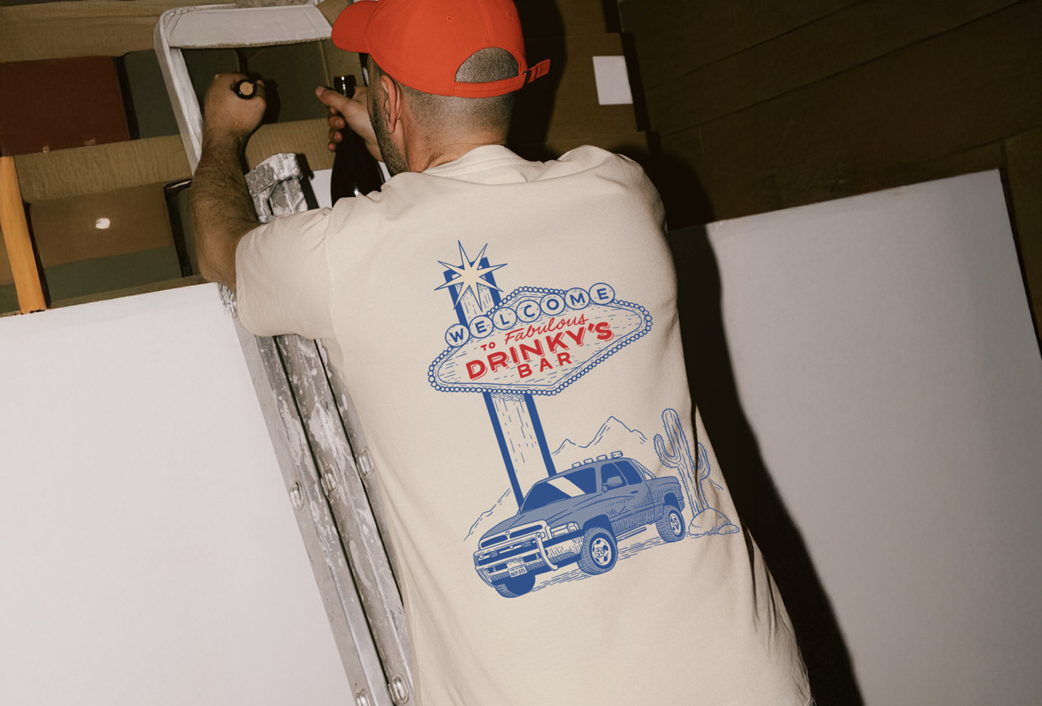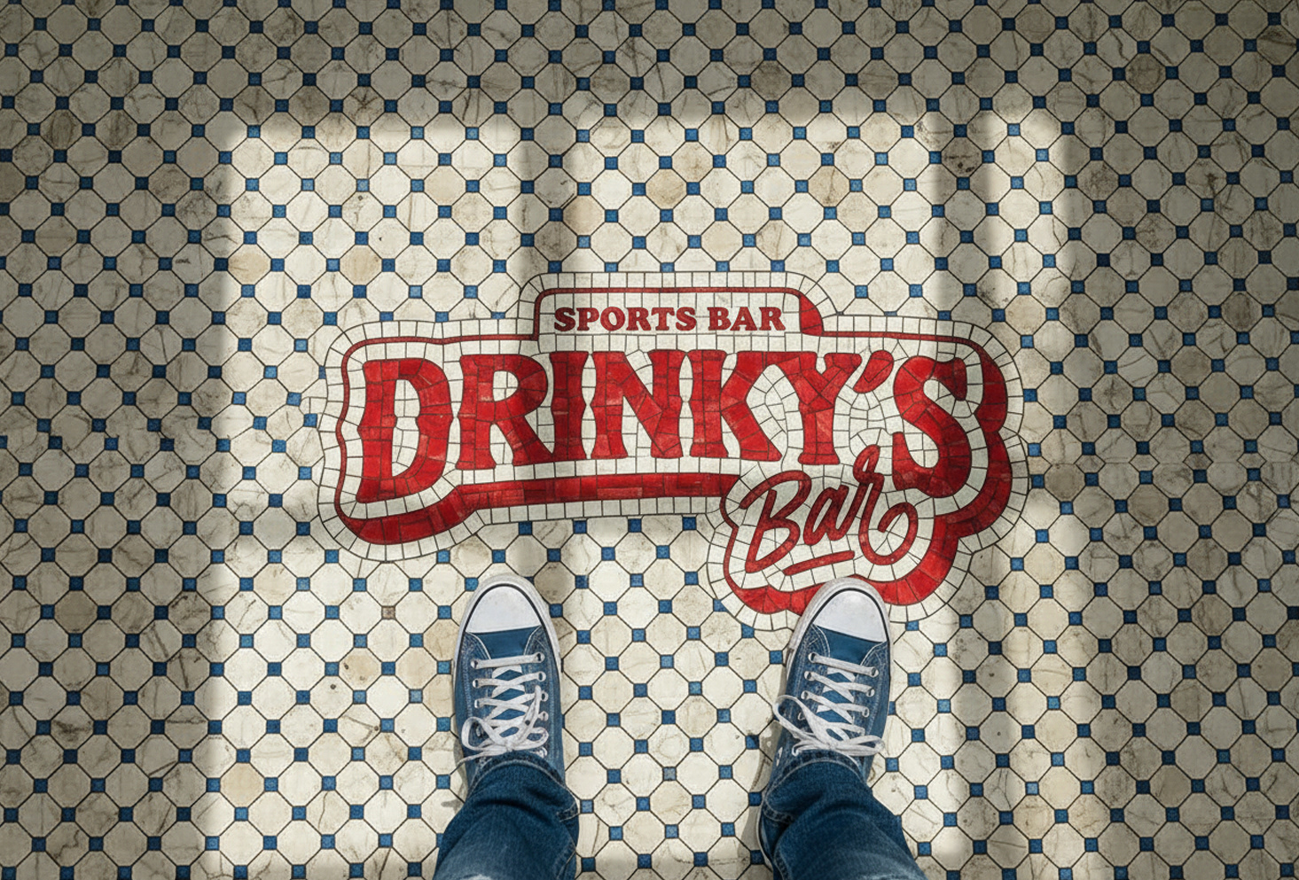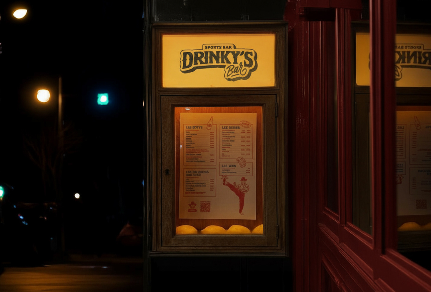 Création compléte de l'identité visuelle du Drinky's Bar (logo, illustrations, menus, etc..) qui est un bar situé à Avignon. Le Drinky's est un bar à vocation sportive, et à de fortes réferences américaines, nottament aux dimanches en famille devant Walker Texas Ranger, qui est l'icone de cet établissement.
