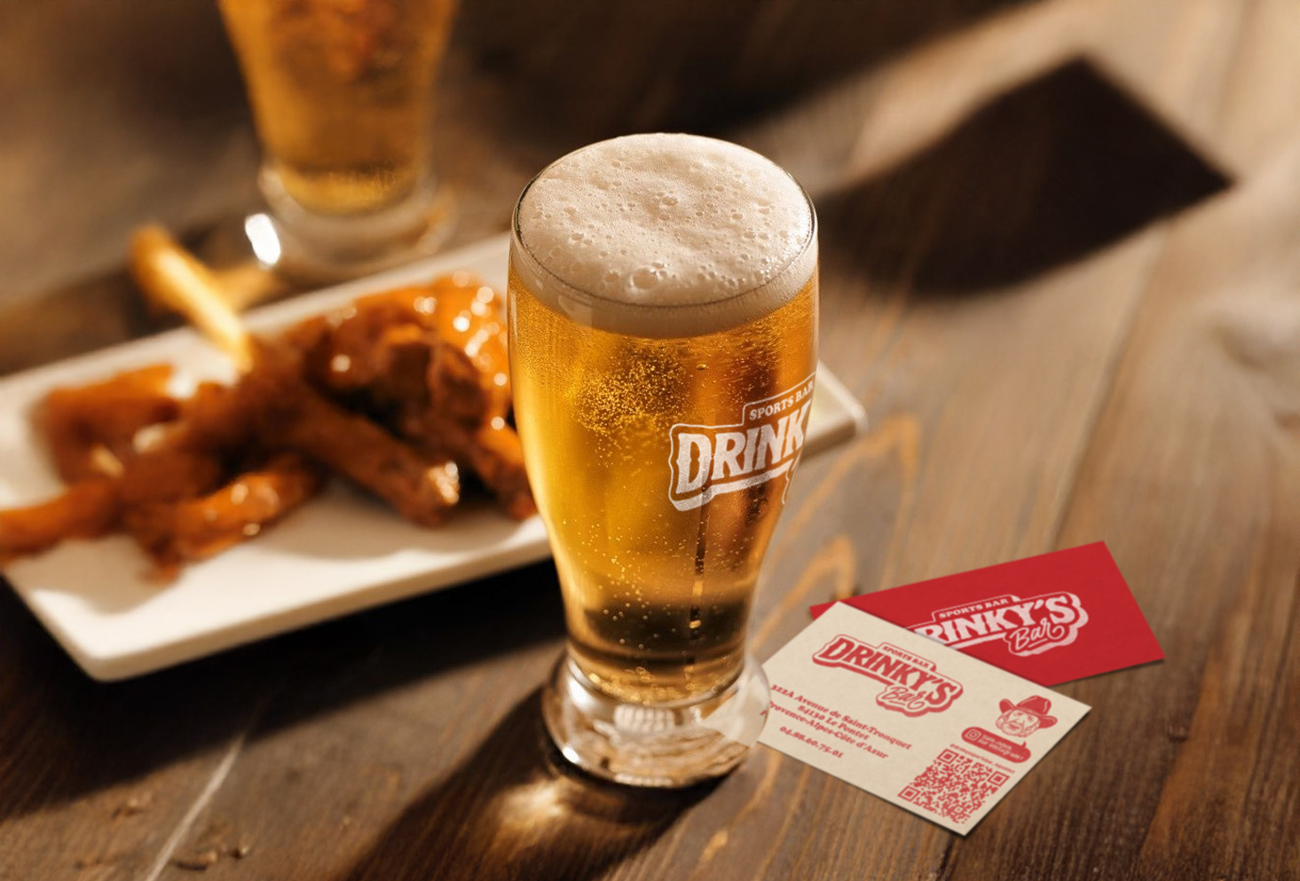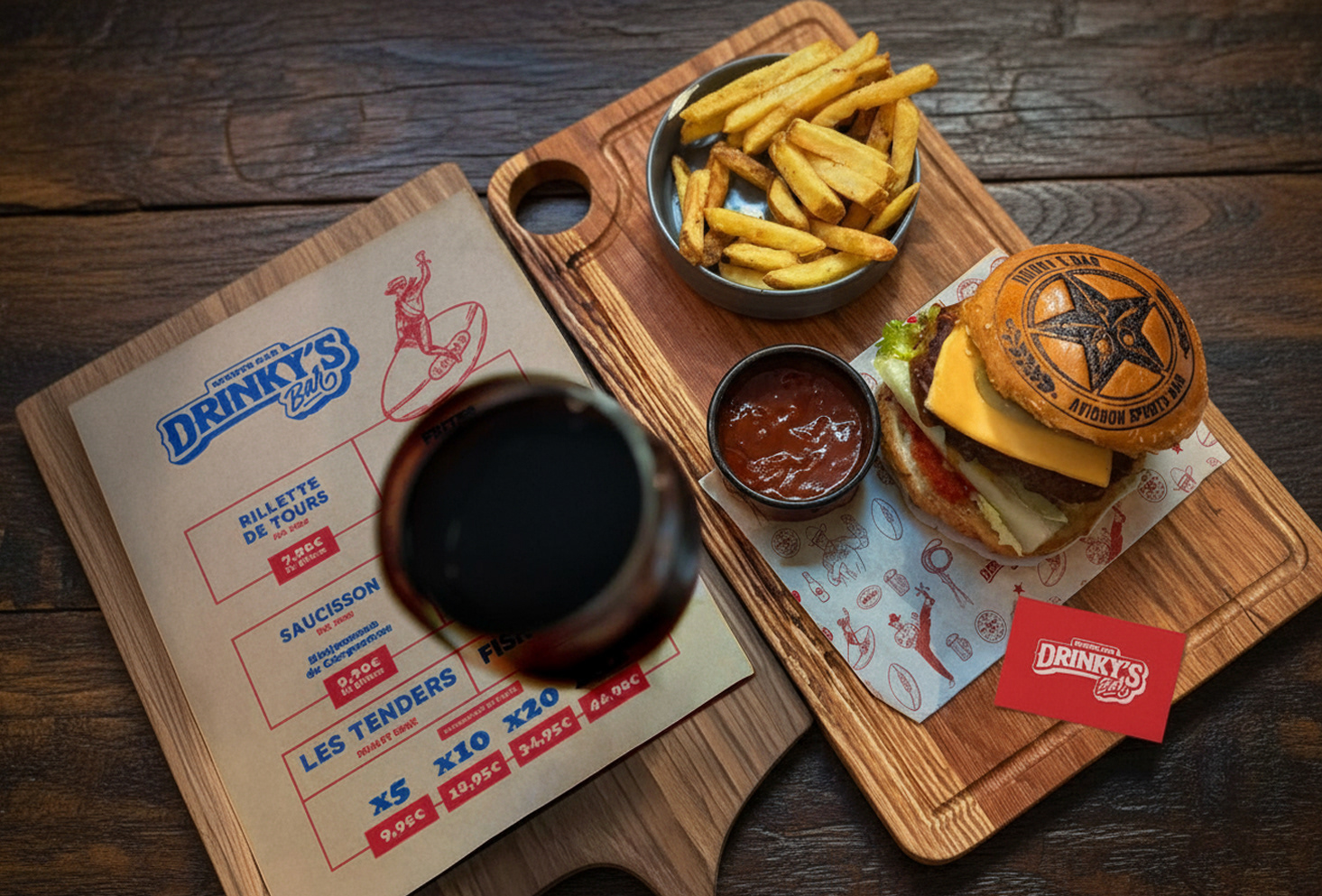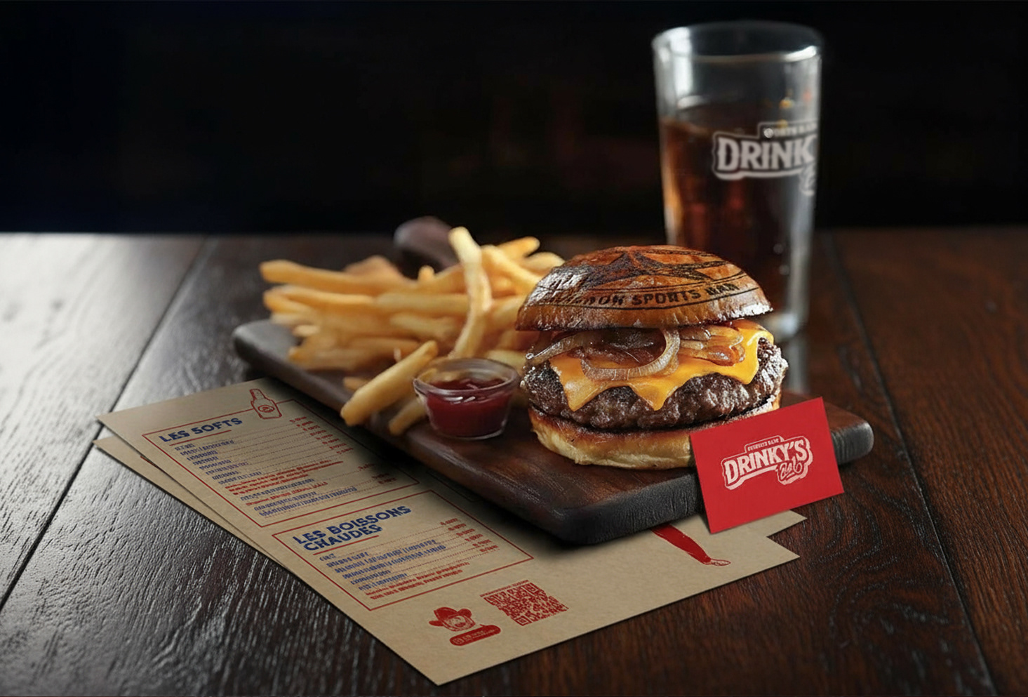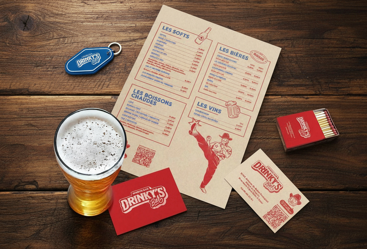 Création compléte de l'identité visuelle du Drinky's Bar (logo, illustrations, menus, etc..) qui est un bar situé à Avignon. Le Drinky's est un bar à vocation sportive, aux fortes références américaines, notamment aux dimanches matin en famille devant Walker Texas Ranger, qui est l’icône de cet établissement.