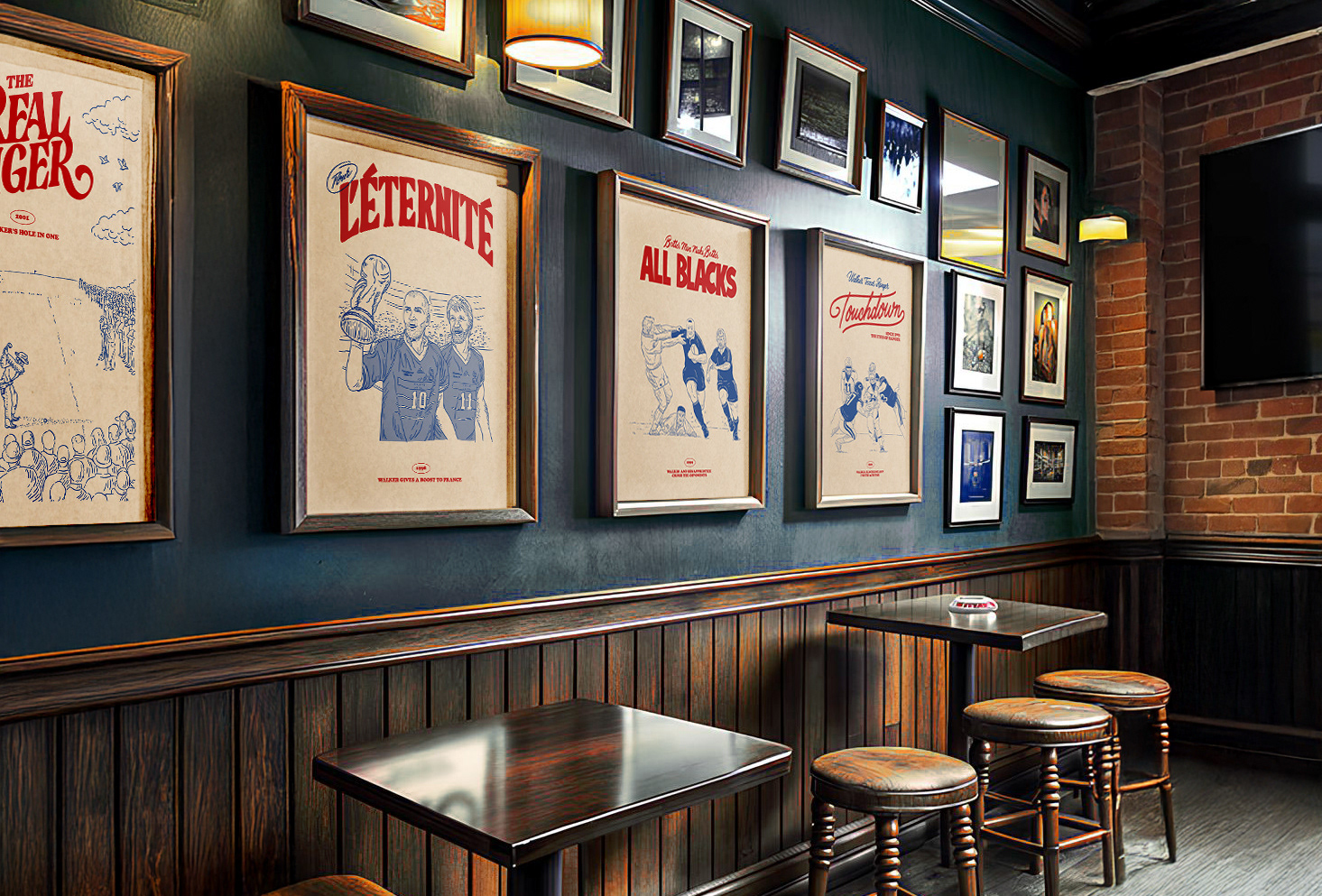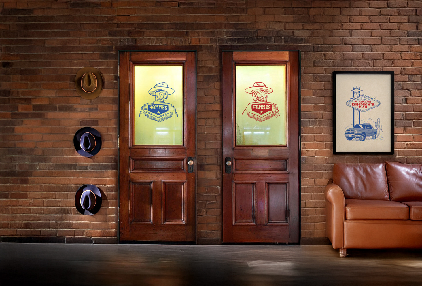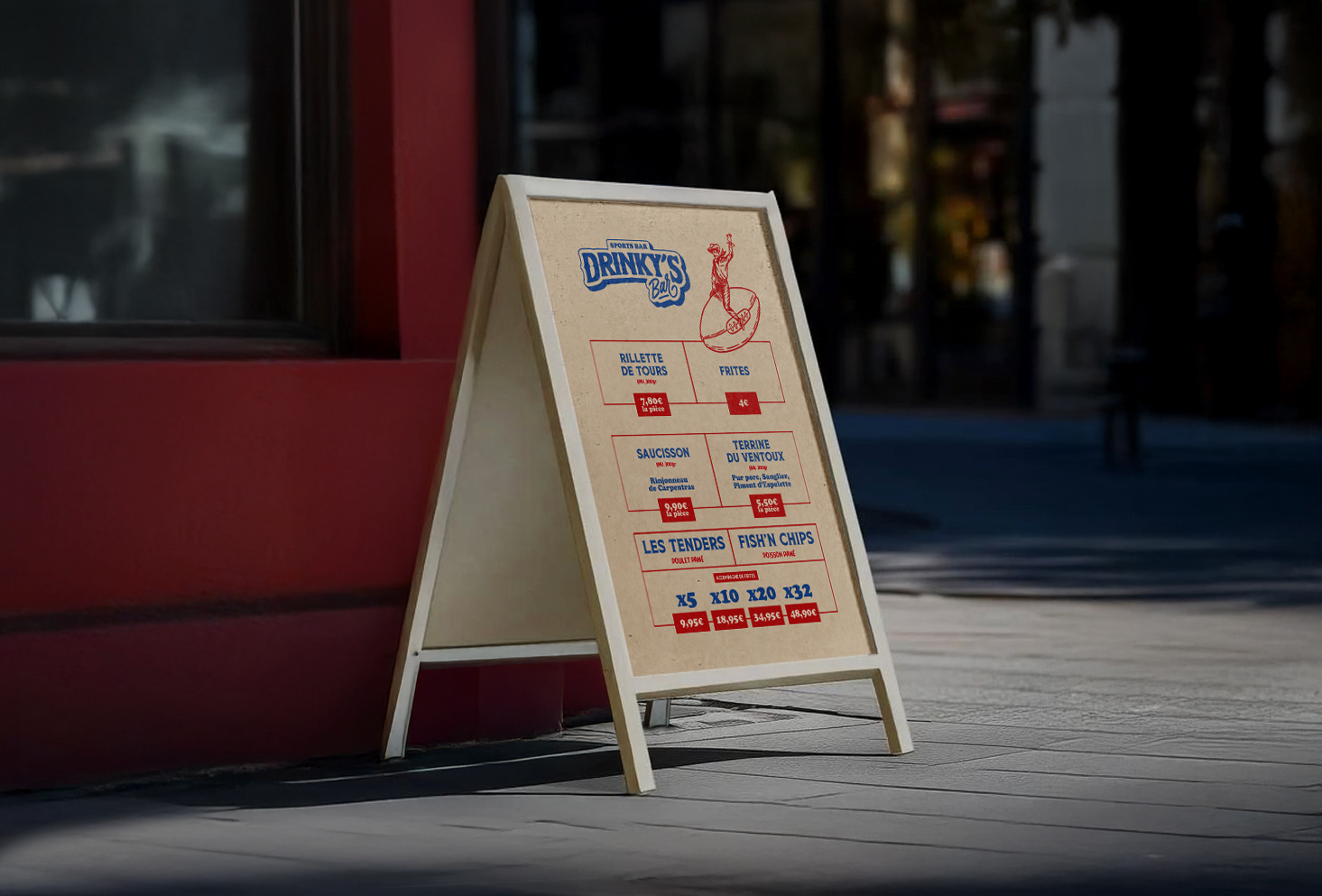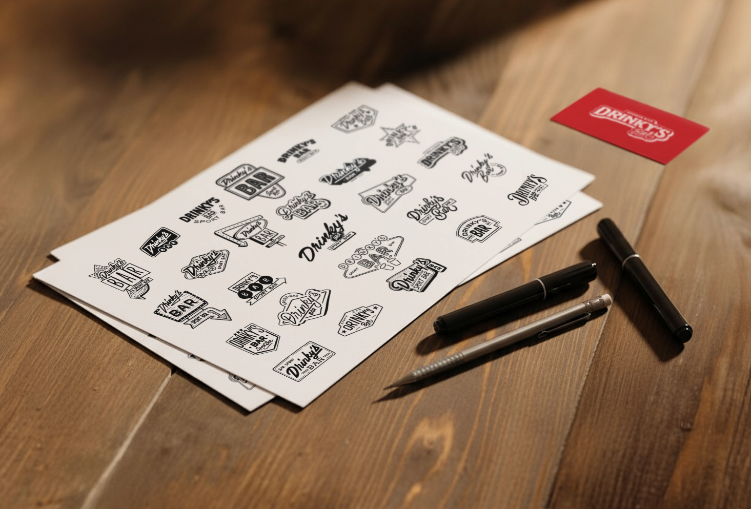 Création compléte de l'identité visuelle du Drinky's Bar (logo, illustrations, menus, etc..) qui est un bar situé à Avignon. Le Drinky's est un bar à vocation sportive, aux fortes références américaines, notamment aux dimanches matin en famille devant Walker Texas Ranger, qui est l’icône de cet établissement.