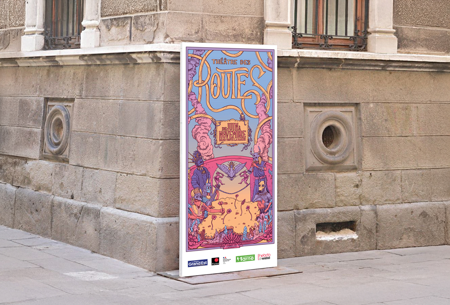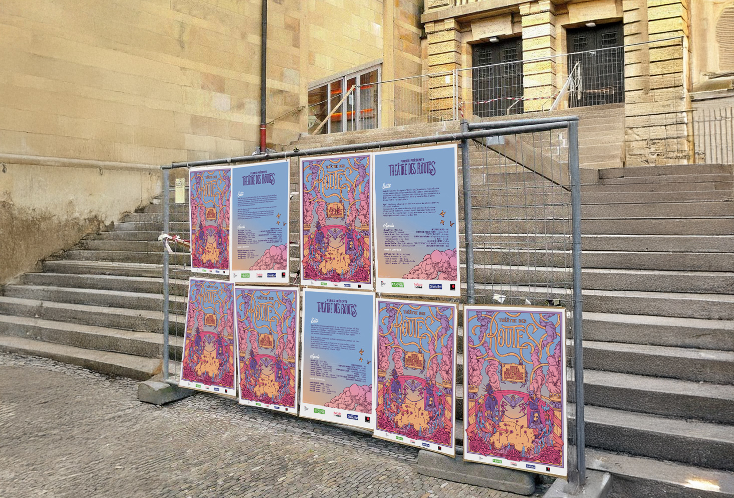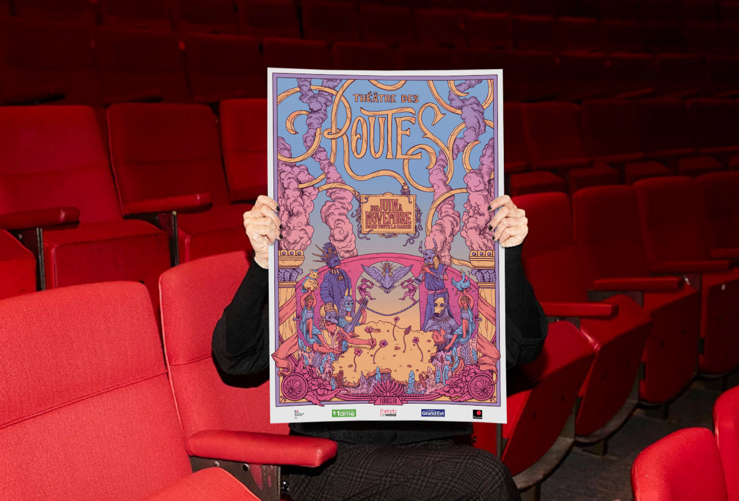 Création de l’affiche du Théâtre des Routes, un projet porté par Furies depuis 2005. Cette aventure artistique itinérante investit l’espace public à travers le territoire, proposant des spectacles accessibles à tous, de mai à octobre.